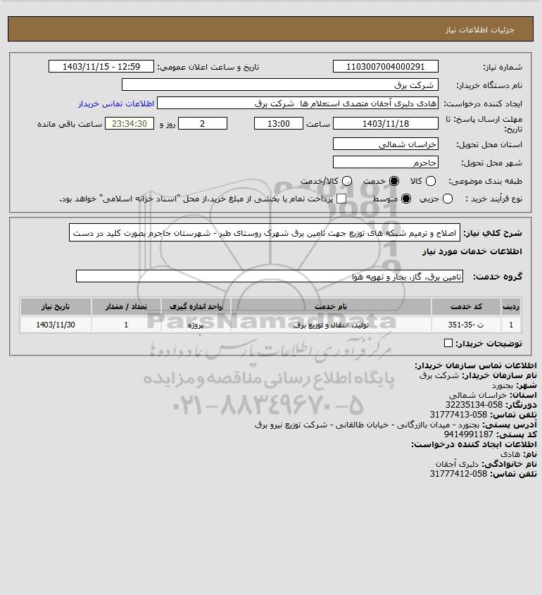 شرح کلی نیاز: اصلاح و ترمیم شبکه های توزیع جهت تامین برق شهرک روستای طبر - شهرستان جاجرم بصورت کلید در دست