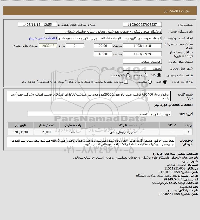 | 1 | -- | پد زیرانداز بیمارستانی | عدد | 20,000 | 1403/11/18 |