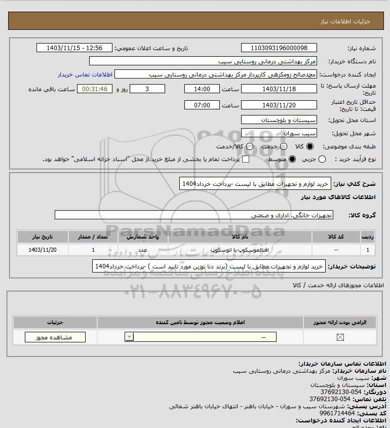 شرح کلی نیاز: خرید لوازم و تجهیزات مطابق با لیست -پرداخت خرداد1404
