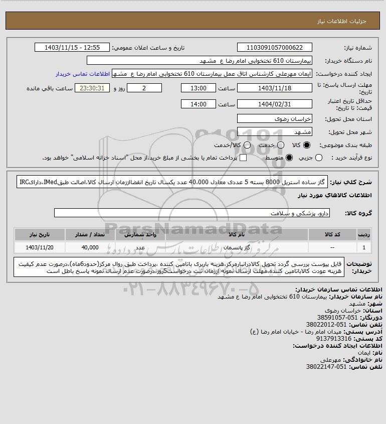نام دستگاه خریدار:بیمارستان 610 تختخوابی امام رضا ع مشهد