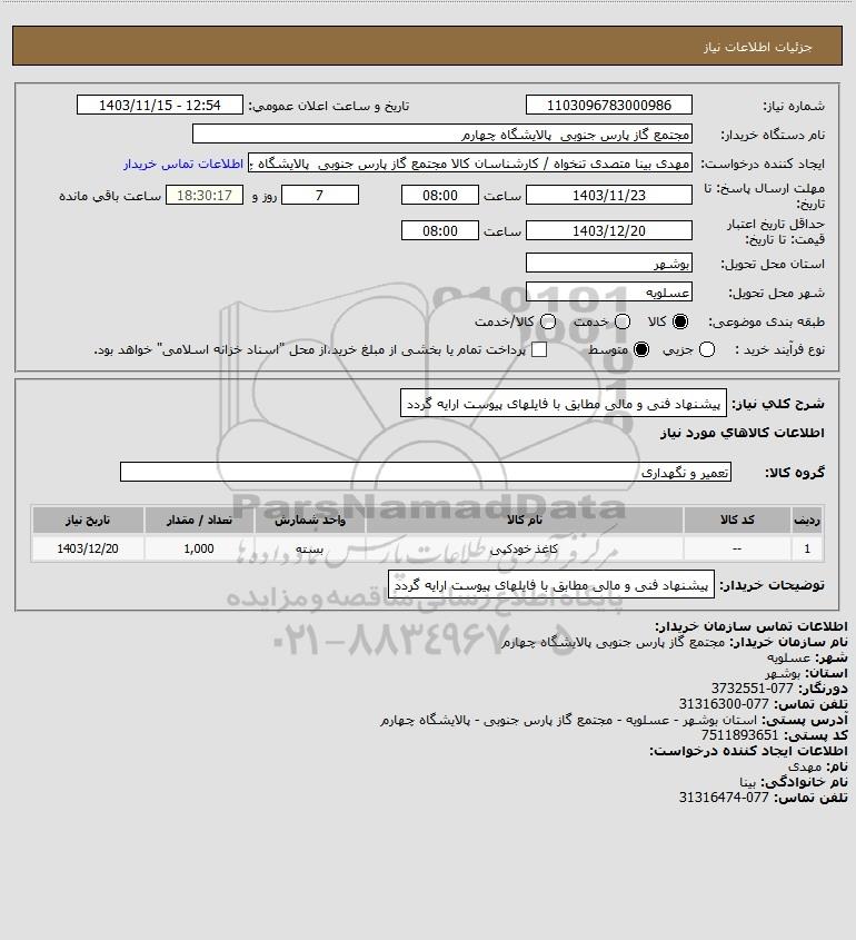 استعلام بها و موضوع استعلام استعلام پیشنهاد فنی و مالی مطابق با فایلهای پیوست ارایه گردد به اطلاع کلیه شرکتها و افراد متخصص واجد شرایط میرساند، آگهی گذار در نظر دارد از طریق استعلام بها، نسبت به انتخاب و دریافت پیشنهادات اقدام نماید. این استعلام با کد آگهی ثبت شده در سامانه خبرگزاری پارس نماد : 8631747 منتشر شده است. مشخصات استعلام : تاریخ شروع استعلام: 1403/11/15 آخرین مهلت ارسال پیشنهاد قیمت : 1403/11/23 و محل اجرای پروژه : استان بوشهر میباشد. استعلام قیمت مورد درخواست : استعلام پیشنهاد فنی و مالی مطابق با فایلهای پیوست ارایه گردد با دستهبندیهای تخصصی و گروه های مرتبط : نوشت افزار, کاغذ و فرم پیوست, استعلام اطلاع رسانی میگردد.