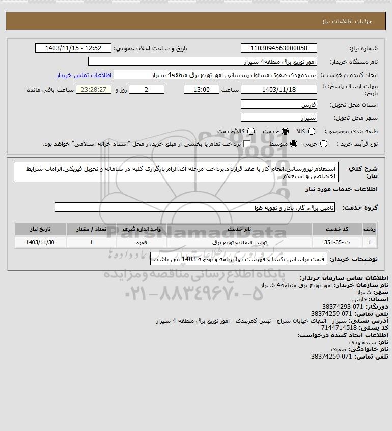نام دستگاه خریدار:امور توزیع برق منطقه4 شیراز