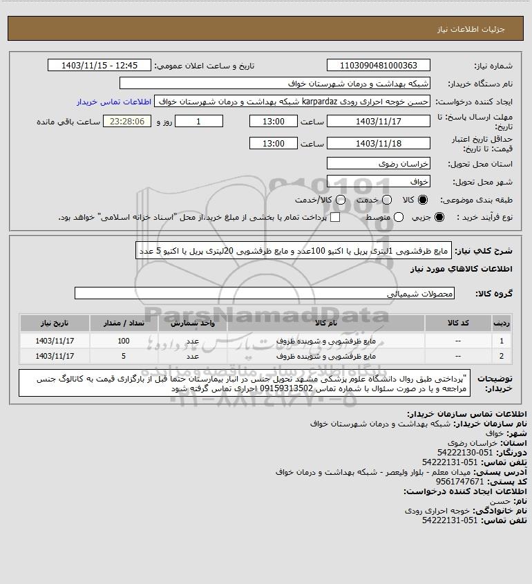 | 1 | -- | مایع ظرفشویی و شوینده ظروف | عدد | 100 | 1403/11/17 |