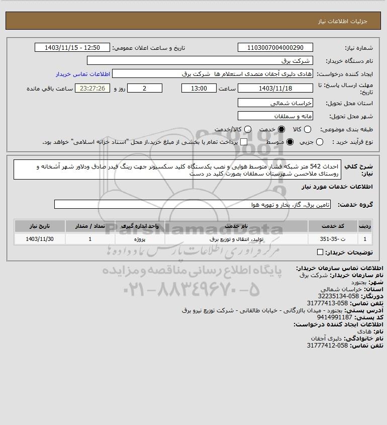 شرح کلی نیاز: احداث 542 متر شبکه فشار متوسط هوایی و نصب یکدستگاه کلید سکسیونر جهت رینگ فیدر صادق ودلاور شهر آشخانه و روستای ملاحسن شهرستان سملقان بصورت کلید در دست