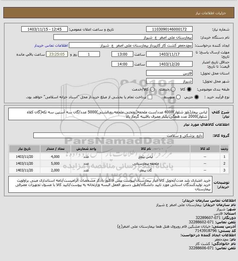 | 3 | -- | گان بیمار | عدد | 2,000 | 1403/11/20 |