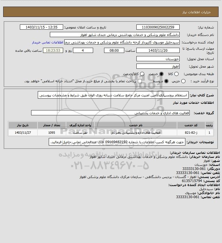 شرح کلی نیاز: استعلام برونسپاری تامین امنیت مرکز جامع سلامت شبانه روزی الوان طبق شرایط و مشخصات پیوستی
