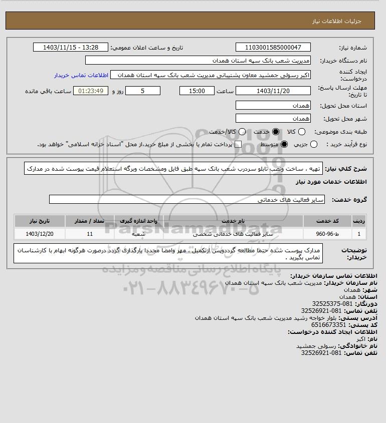 شرح کلی نیاز: تهیه ، ساخت ونصب تابلو سردرب شعب بانک سپه طبق فایل ومشخصات وبرگه استعلام قیمت پیوست شده در مدارک