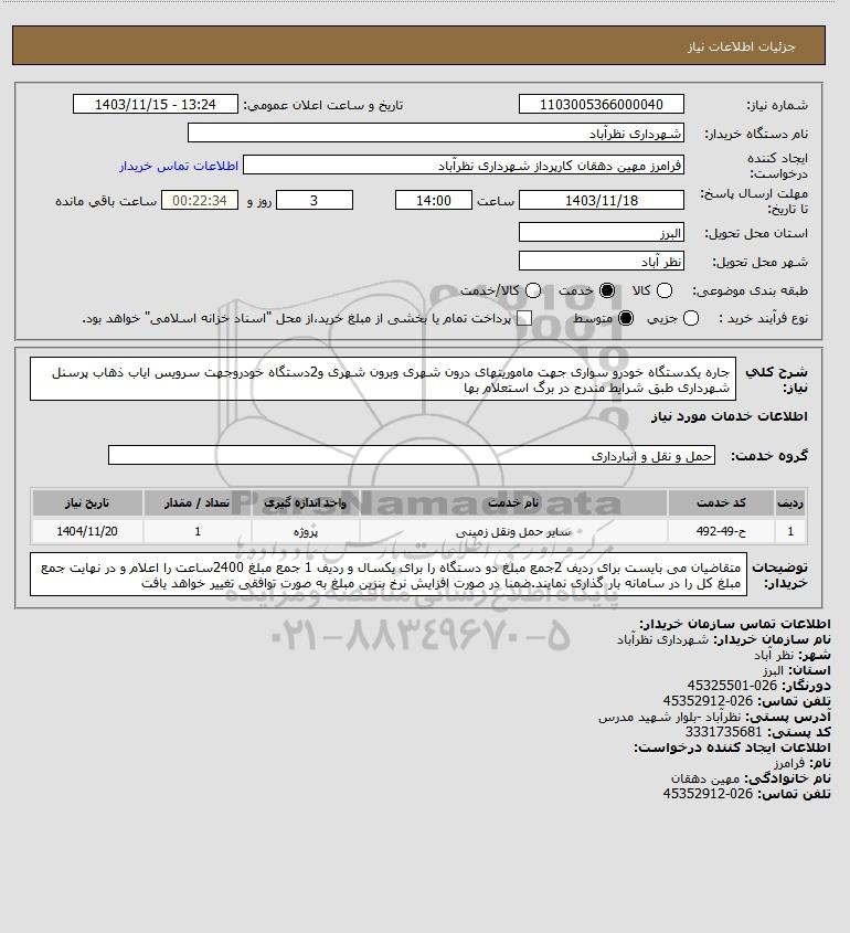 استعلام بها و موضوع استعلام استعلام جاره یکدستگاه خودرو سواری جهت ماموریتهای درون شهری وبرون شهری و2دستگاه خودروجهت سرویس ایاب ذهاب پرسنل شهرداری طبق شرایط مندرج در برگ استعلام بها به اطلاع کلیه شرکت‌ها و افراد متخصص واجد شرایط می‌رساند، آگهی گذار در نظر دارد از طریق استعلام بها، نسبت به انتخاب و دریافت پیشنهادات اقدام نماید. این استعلام با کد آگهی ثبت شده در سامانه خبرگزاری پارس نماد : 8631890 منتشر شده است. مشخصات استعلام : تاریخ شروع استعلام: 1403/11/15 آخرین مهلت ارسال پیشنهاد قیمت : 1403/11/18 و محل اجرای پروژه : استان البرز میباشد. استعلام قیمت مورد درخواست : استعلام جاره یکدستگاه خودرو سواری جهت ماموریتهای درون شهری وبرون شهری و2دستگاه خودروجهت سرویس ایاب ذهاب پرسنل شهرداری طبق شرایط مندرج در برگ استعلام بها با دسته‌بندی‌های تخصصی و گروه های مرتبط : ایاب و ذهاب, استعلام اطلاع رسانی میگردد.
