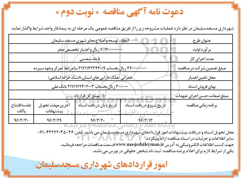 - جهت کسب اطلاعات الکترونیکی به آدرس www.masjedsileyman.ir قسمت مناقصات مراجعه فرمائید.