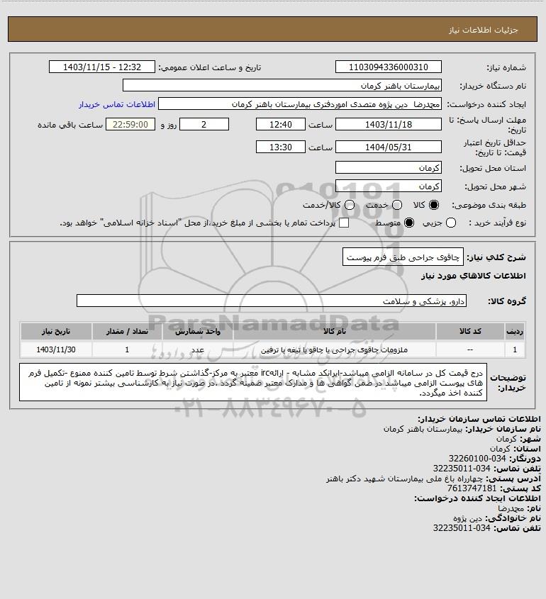 شرح کلی نیاز: چاقوی جراحی طبق فرم پیوست