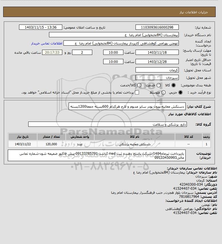 شرح کلی نیاز: دستکش معاینه بدون پودر سایز مدیوم و لارج هرکدام 600بسته جمعا1200بسته