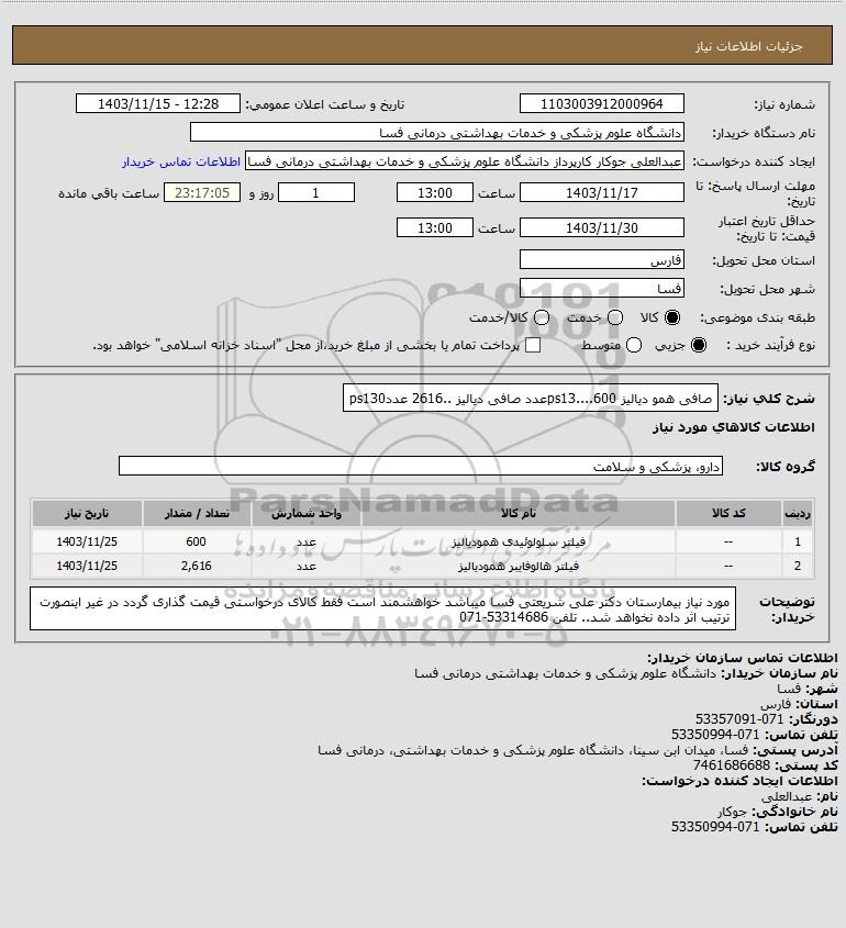 شرح کلی نیاز: صافی همو دیالیز ps13....600عدد