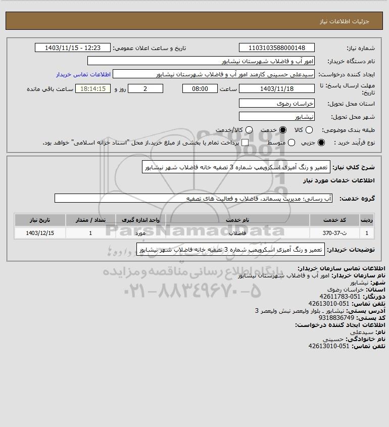 شرح کلی نیاز: تعمیر و رنگ آمیزی اسکروپمپ شماره 3 تصفیه خانه فاضلاب شهر نیشابور