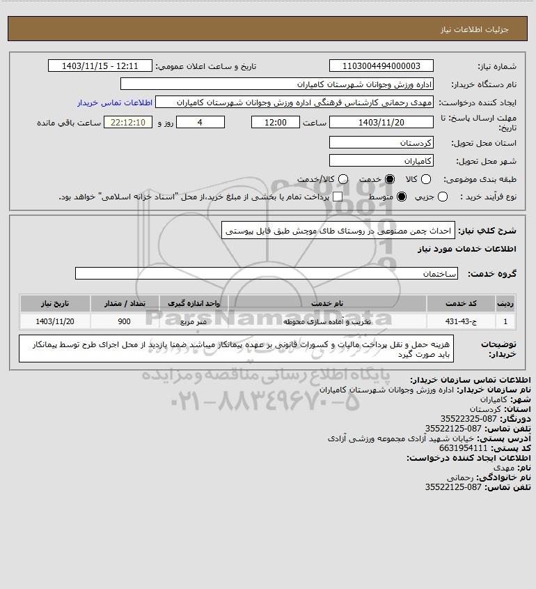 شرح کلی نیاز: احداث چمن مصنوعی در روستای طای موچش طبق فایل پیوستی
