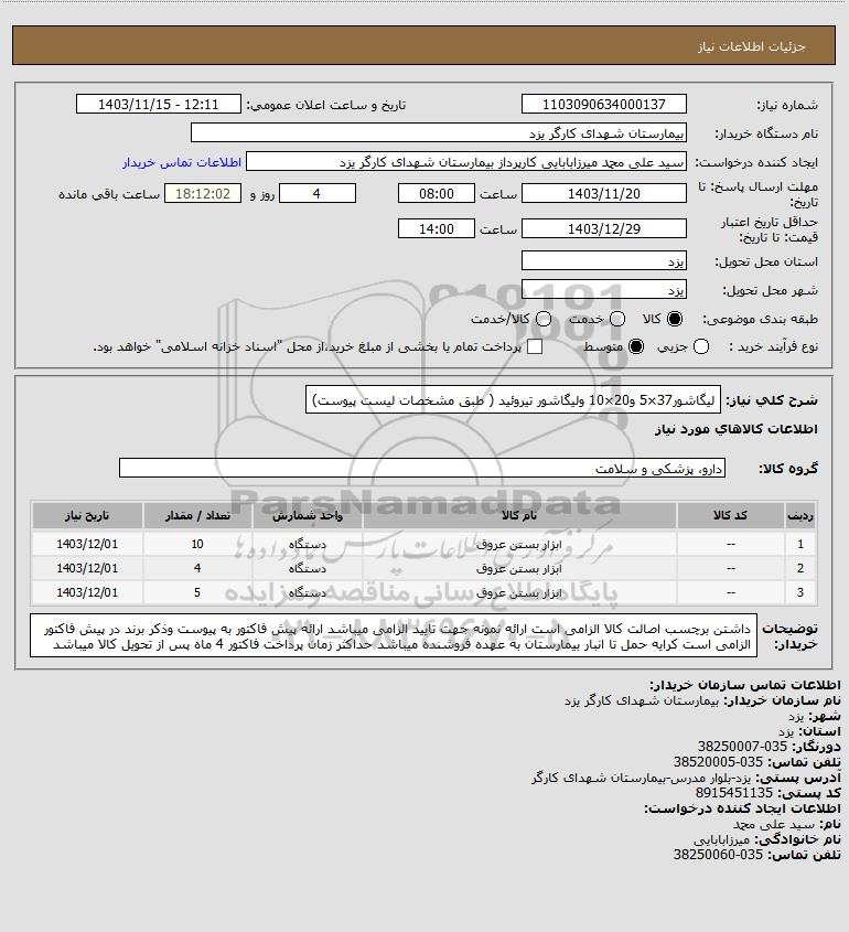 شرح کلی نیاز: لیگاشور37×5 و20×10 ولیگاشور تیروئید ( طبق مشخصات لیست پیوست)