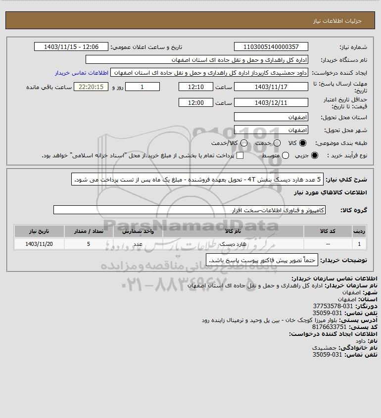 شرح کلی نیاز: 5 عدد هارد دیسک بنفش 4T - تحویل بعهده فروشنده - مبلغ یک ماه پس از تست پرداخت می شود.