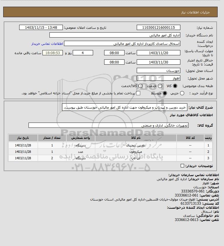 شرح کلی نیاز: خرید دوربین و لپ تاپ و میکروفون جهت اداره کل امور مالیاتی خوزستان طبق پیوست.