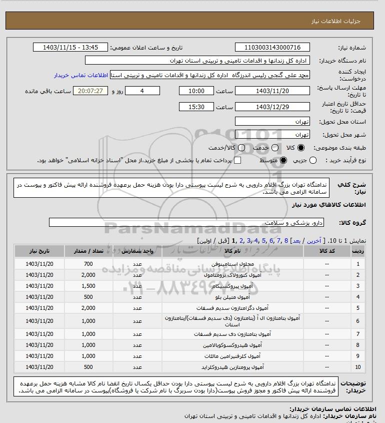 شرح کلی نیاز: ندامتگاه تهران بزرگ اقلام دارویی به شرح لیست پیوستی دارا بودن هزینه حمل برعهده فروشنده ارائه پیش فاکتور و پیوست در سامانه الزامی می باشد.