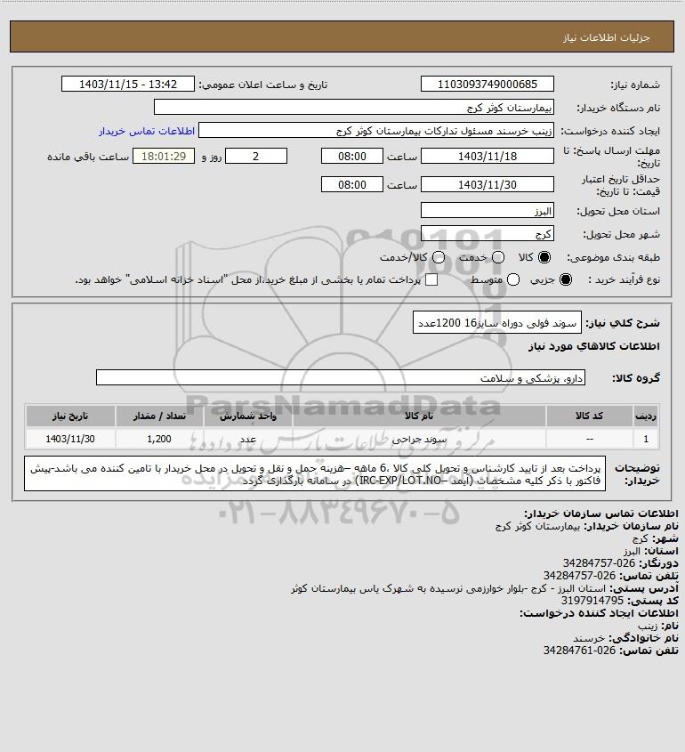 شرح کلی نیاز: سوند فولی دوراه سایز16 1200عدد