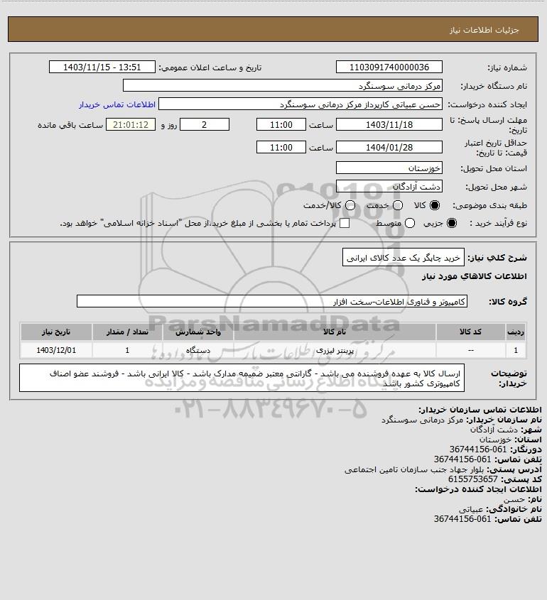 شرح کلی نیاز: خرید چاپگر یک عدد کالای ایرانی