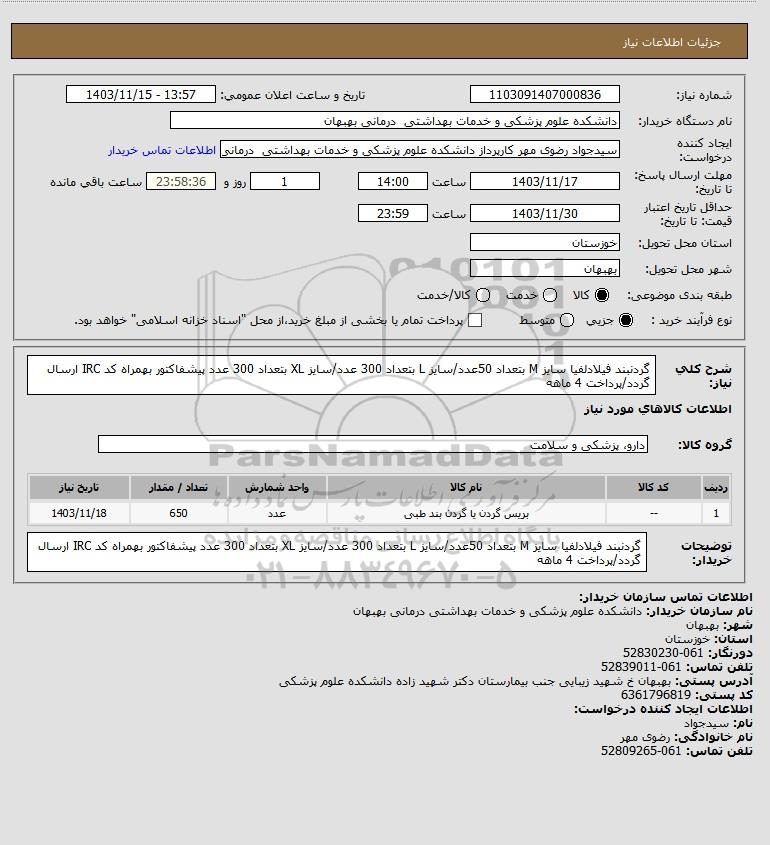 شرح کلی نیاز: گردنبند فیلادلفیا سایز M بتعداد 50عدد/سایز L بتعداد 300 عدد/سایز XL بتعداد 300 عدد پیشفاکتور بهمراه کد IRC ارسال گردد/پرداخت 4 ماهه