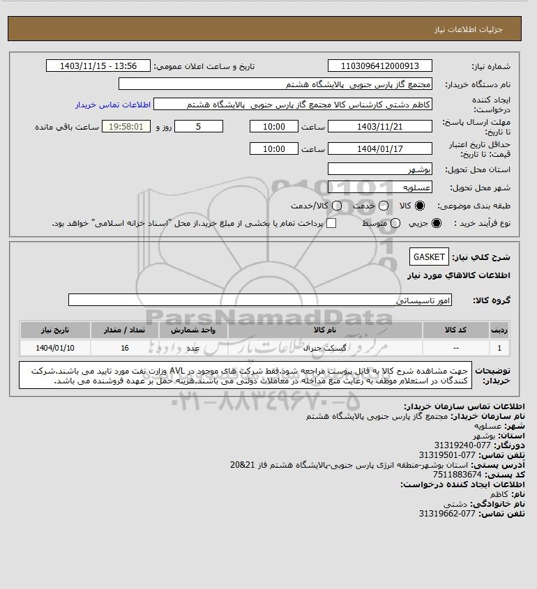 نام دستگاه خریدار:مجتمع گاز پارس جنوبی پالایشگاه هشتم