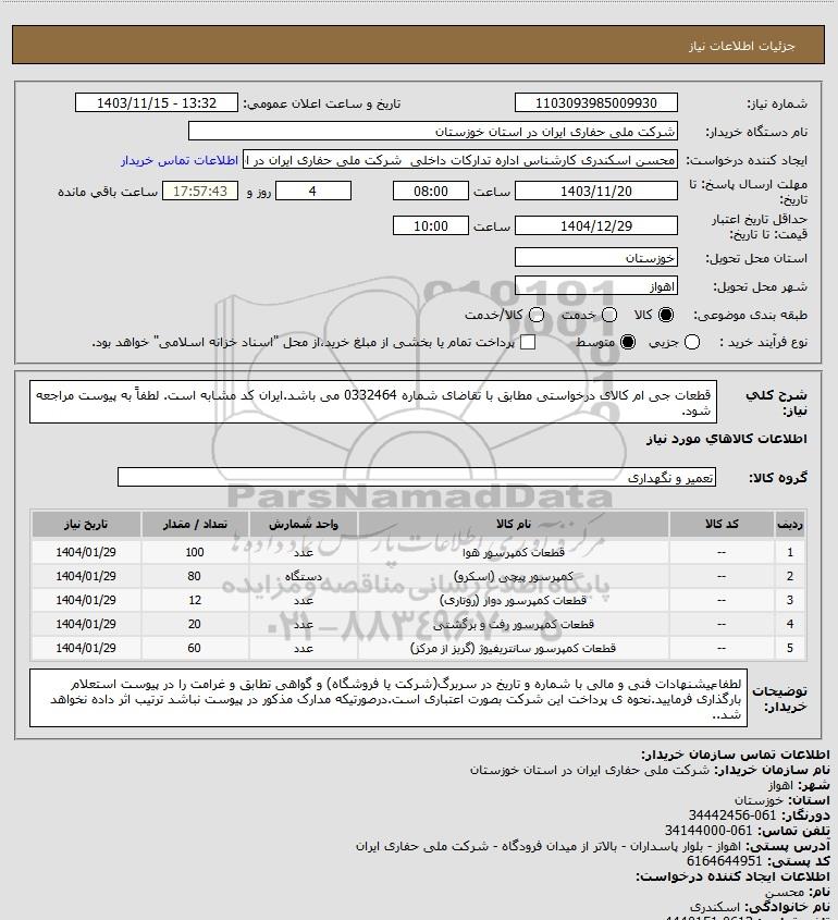 شرح کلی نیاز: قطعات جی ام کالای درخواستی مطابق با تقاضای شماره 0332464 می باشد.ایران کد مشابه است. لطفاً به پیوست مراجعه شود.