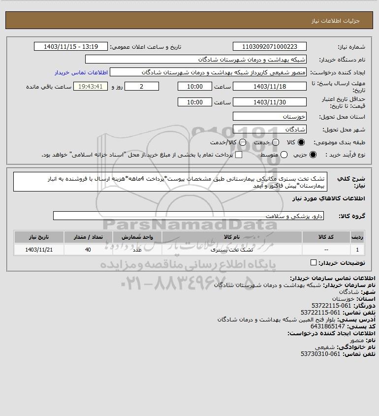 شرح کلی نیاز: تشک تخت بستری مکانیکی بیمارستانی طبق مشخصات پیوست*پرداخت 4ماهه*هزینه ارسال با فروشنده به انبار بیمارستان*پیش فاکتور و آیمد