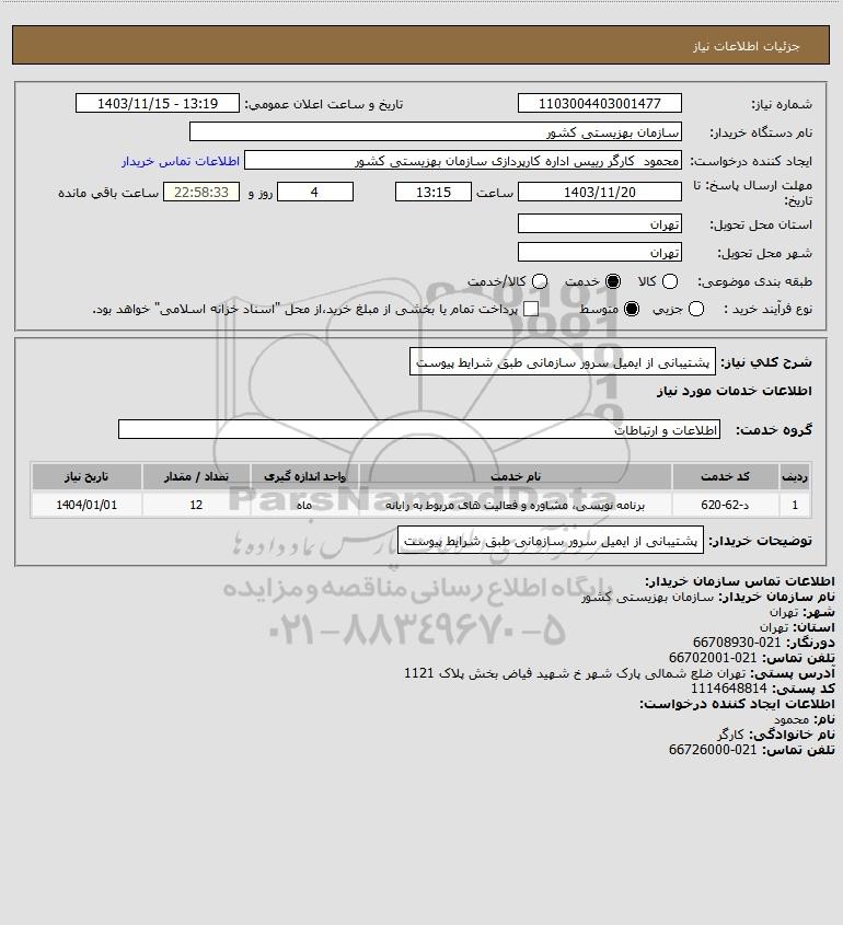 شرح کلی نیاز: پشتیبانی از ایمیل سرور سازمانی طبق شرایط پیوست