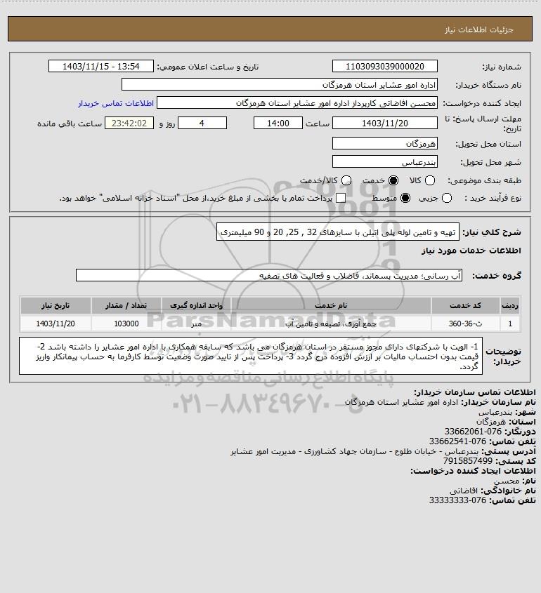شرح کلی نیاز: تهیه و تامین لوله پلی اتیلن با سایزهای 32 , 25, 20 و 90 میلیمتری