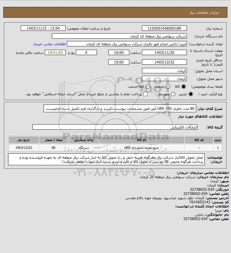 نام دستگاه خریدار:شرکت سهامی برق منطقه ای کرمان