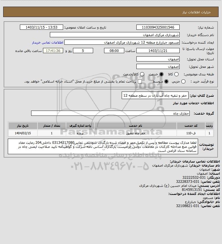 شرح کلی نیاز: حفر و تنقیه چاه آب باران در سطح منطقه 12