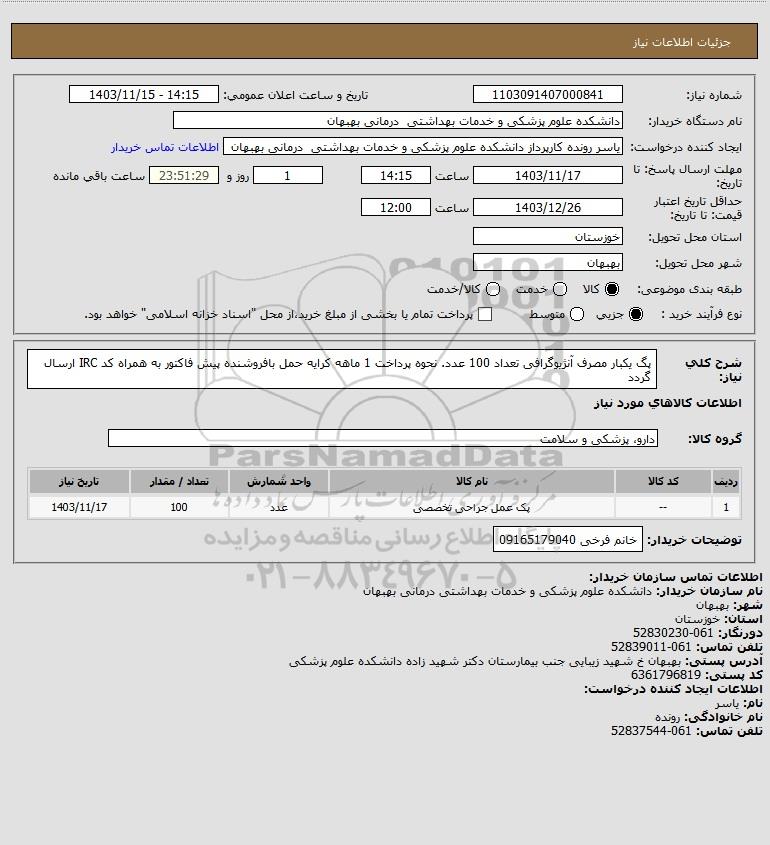 شرح کلی نیاز: پگ یکبار مصرف آنژیوگرافی تعداد 100 عدد. نحوه پرداخت 1 ماهه کرایه حمل بافروشنده پیش فاکتور به همراه کد IRC ارسال گردد