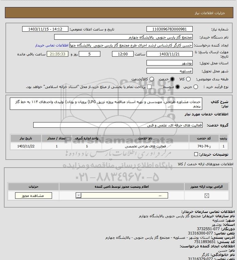 نام دستگاه خریدار:مجتمع گاز پارس جنوبی پالایشگاه چهارم