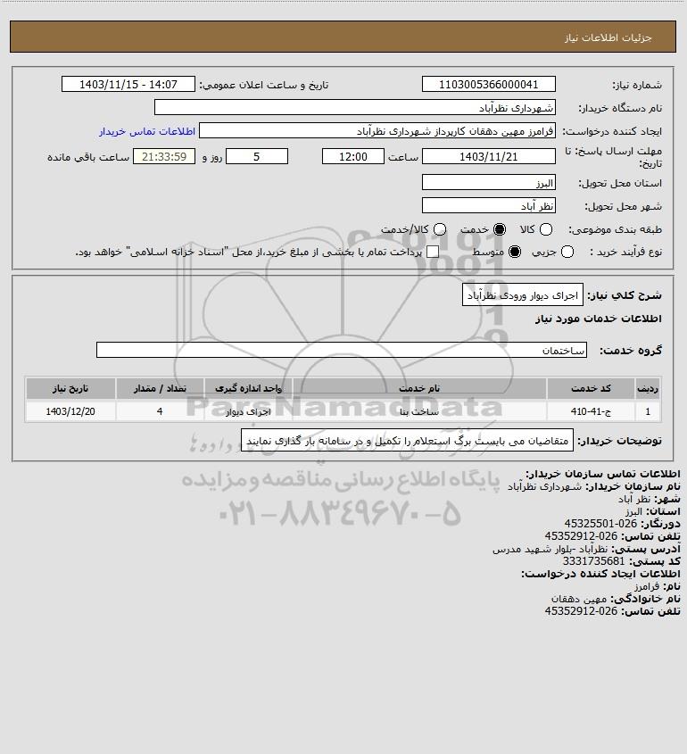شرح کلی نیاز: اجرای دیوار ورودی نظرآباد