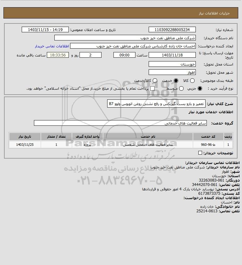 شرح کلی نیاز: تعمیر و بازو بست گیربکس و رفع نشتی روغن اتوبوس ولوو B7