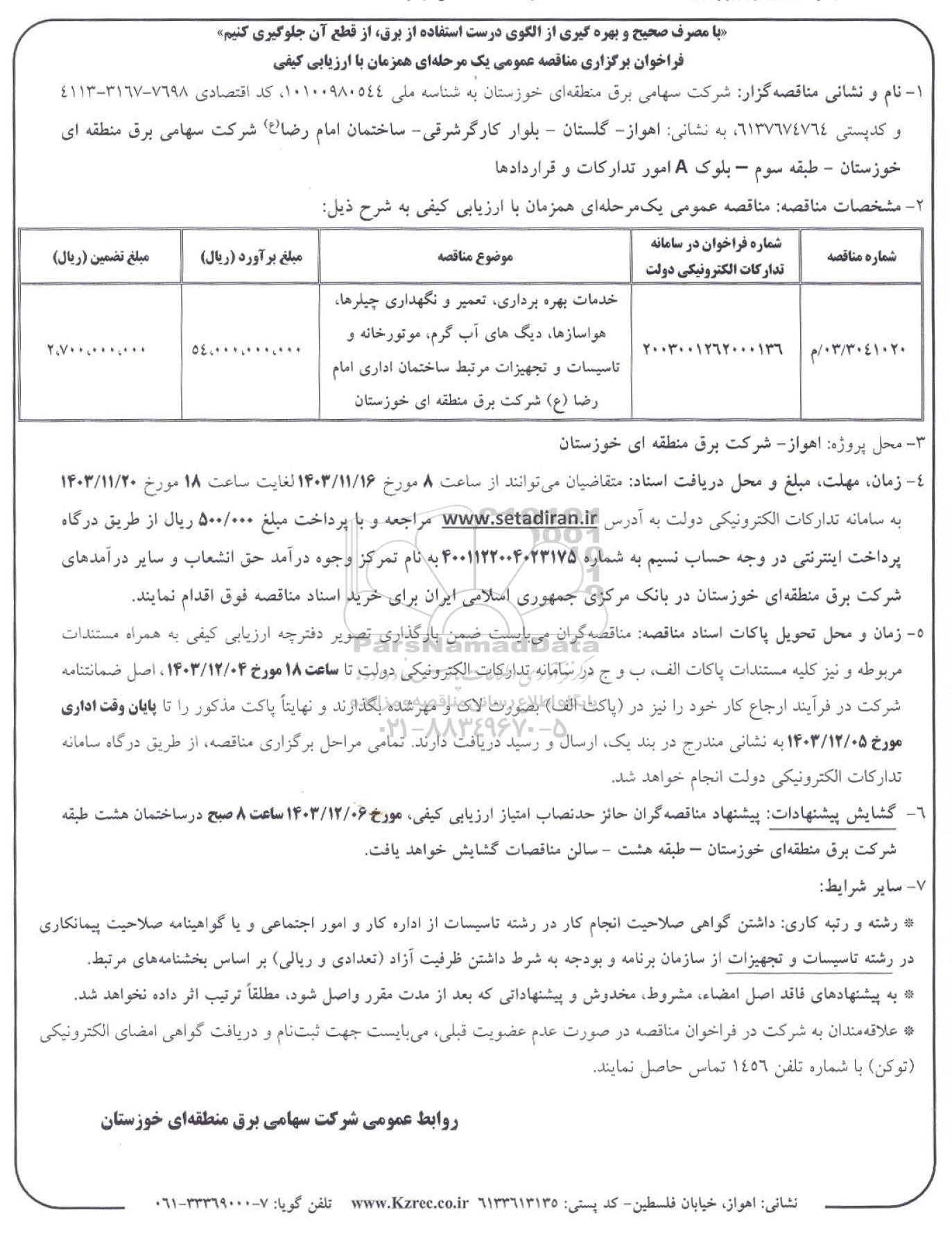 3041020.03.م | 200301262000136 | خدمات بهره برداری تعمیر و نگهداری چیلرها هواسازها دیگهای آب گرم موتورخانه و تاسیسات و تجهیزات مرتبط ساختمان اداری امام رضا (ع) شرکت برق منطقه ای خوزستان | 54.000.000.000 | 2.700.000.000 |