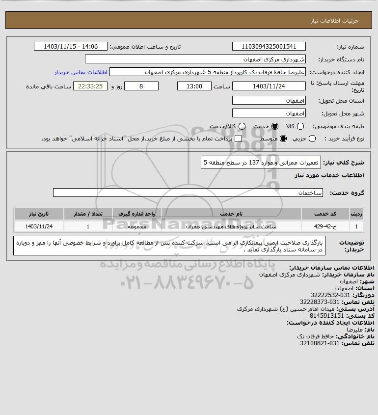 شرح کلی نیاز: تعمیرات عمرانی و موارد 137 در سطح منطقه 5