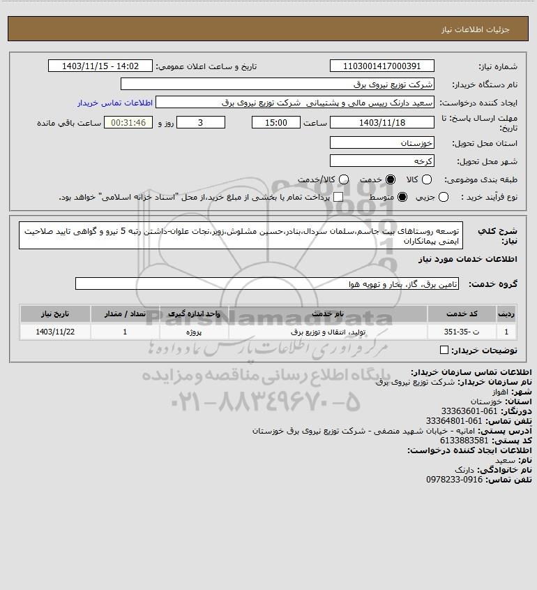 شرح کلی نیاز: توسعه روستاهای بیت جاسم،سلمان سردال،بنادر،حسین مشلوش،زویر،نجات علوان-داشتن رتبه 5 نیرو و گواهی تایید صلاحیت ایمنی پیمانکاران