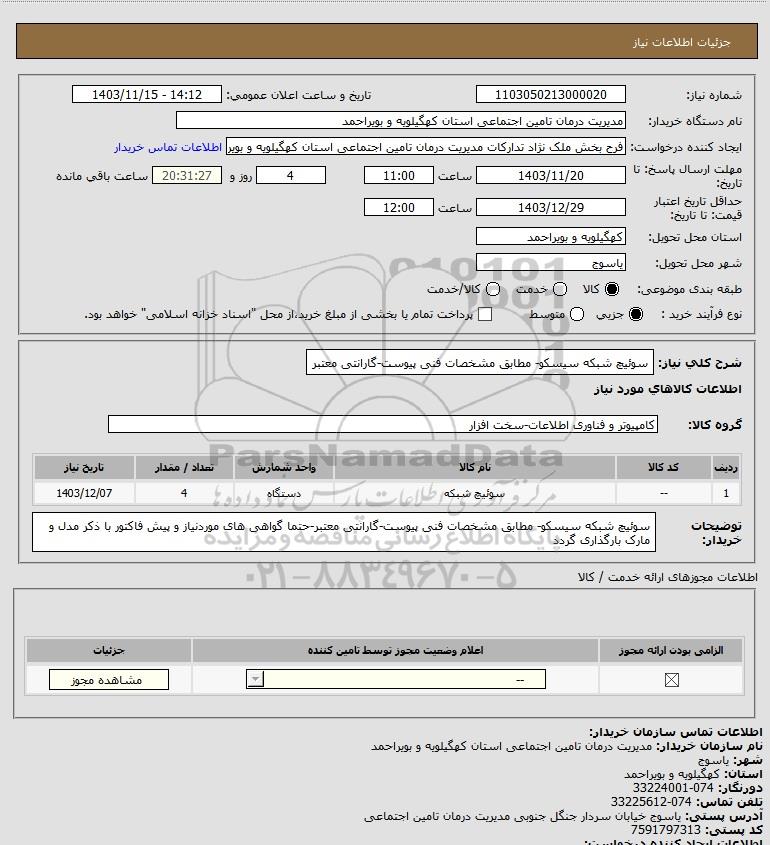 شرح کلی نیاز: سوئیچ شبکه سیسکو- مطابق مشخصات فنی پیوست-گارانتی معتبر