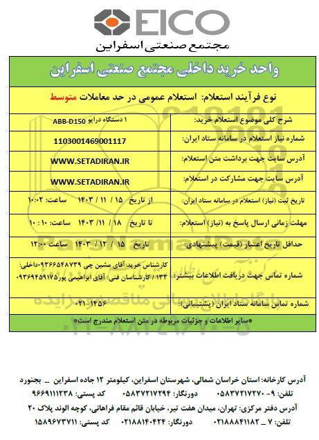 استعلام خرید 1 دستگاه درایو ABB - D150  - مناقصه روز دوشنبه پانزدهم بهمن ماه 1403, استعلام خرید 1 دستگاه درایو ABB - D150