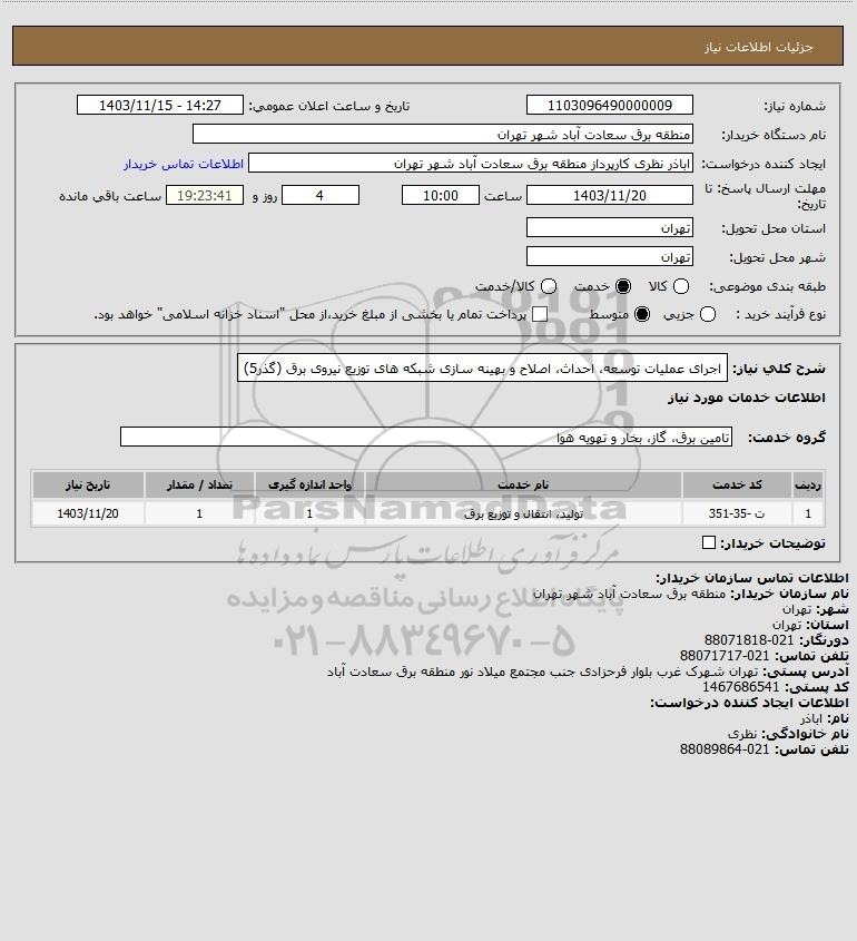 شرح کلی نیاز: اجرای عملیات توسعه، احداث، اصلاح و بهینه سازی شبکه های توزیع نیروی برق (گذر5)