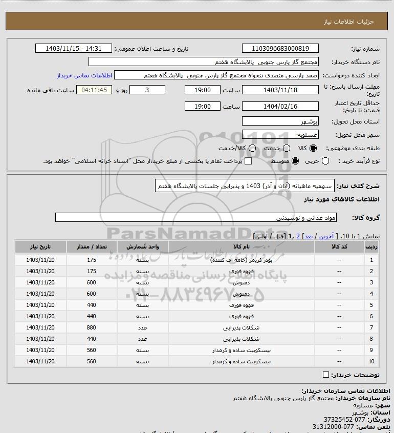 شرح کلی نیاز: سهمیه ماهیانه (آبان و آذر) 1403 و پذیرایی جلسات پالایشگاه هفتم