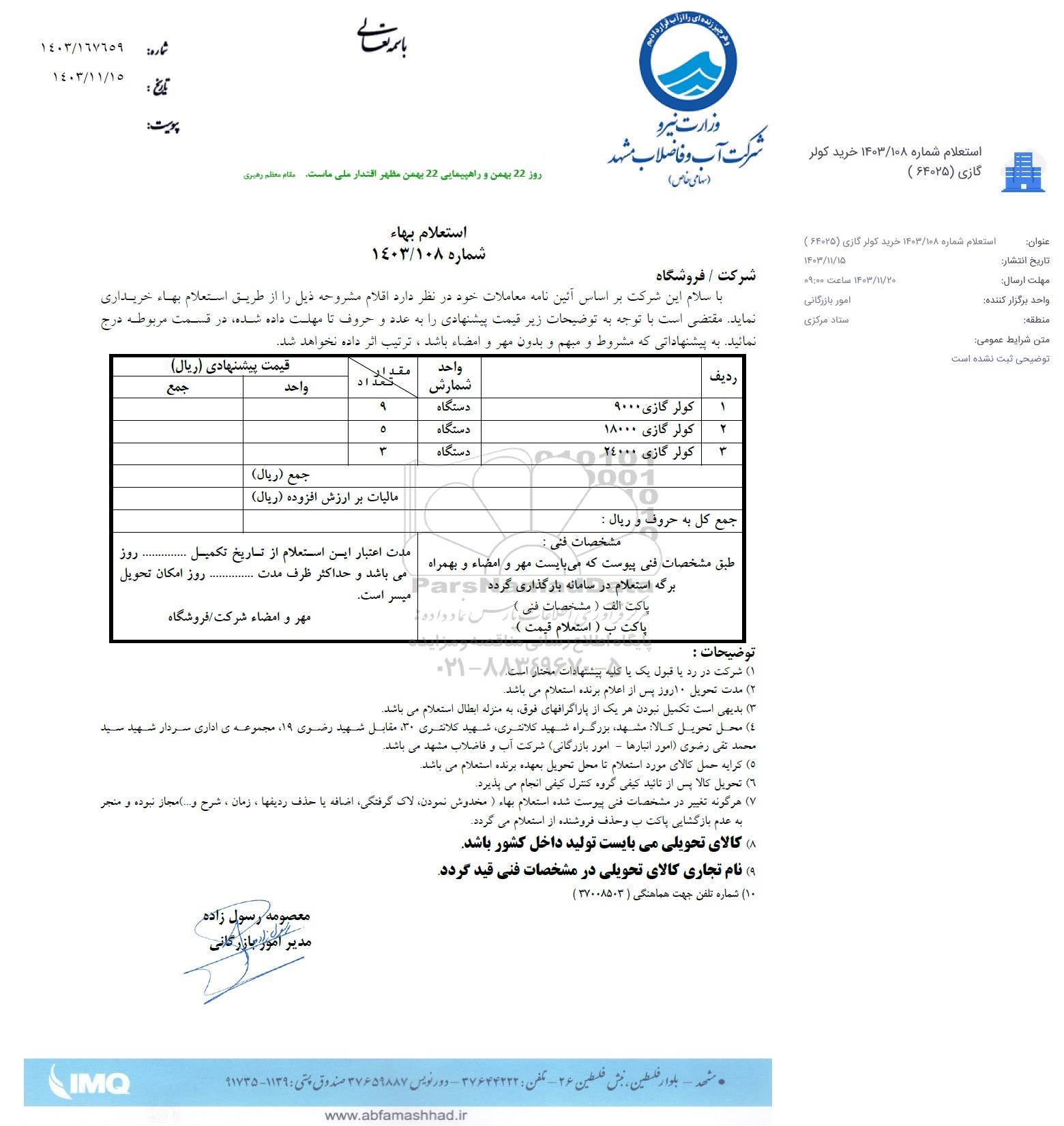 این شرکت براساس آئین نامه معاملات خود در نظر دارد اقلام مشروحه ذیل را از طریق استعلام بها خریداری نماید. مقتضی است با توجه به توضیحات زیر قیمت پیشنهادی را به عدد و حروف تا مهلت داده شده در قسمت مربوطه درج نمائید. به پیشنهاداتی که مشروط و مبهم و بدون مهر و امضا باشد و یا بعد از موعد مقرر اعلام گردد ترتیب اثر داده نخواهد شد.