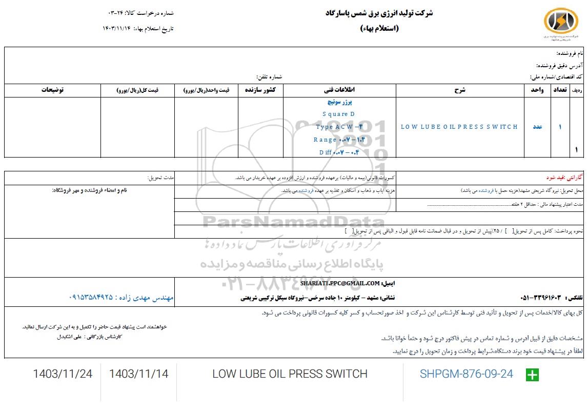 | ا | 1 | عدد | LOW LUBE OIL PRESS SWITCH | پرژر سوئیج Square D Type ACW-4 Range 0.07-1.4 Diff 0.07-0.4 |