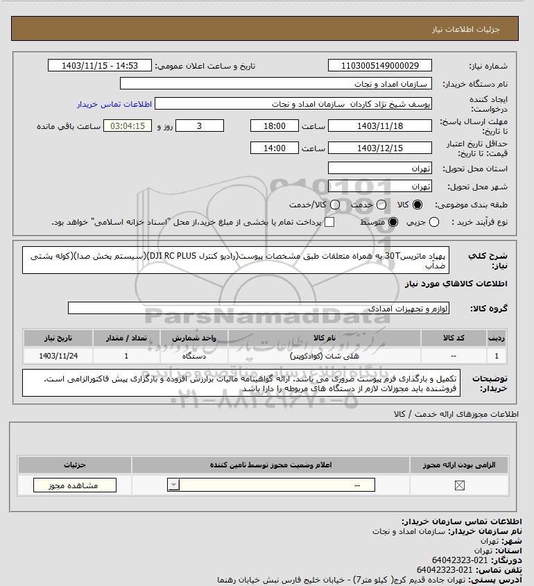 شرح کلی نیاز: پهپاد ماتریس30T به همراه متعلقات طبق مشخصات پیوست(رادیو کنترل DJI RC PLUS)(سیستم پخش صدا)(کوله پشتی ضدآب