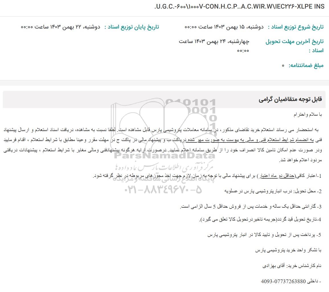 به استحضار می رساند استعلام خرید تقاضای مذکور در سامانه معاملات پتروشیمی پارس قابل مشاهده است. لطفا نسبت به مشاهده دریافت اسناد استعلام و ارسال پیشنهاد فنی به انضمام شرایط استعلام فنی و مالی به پیوست به صورت مهر شده در پاکت ب و پیشنهاد مالی در پاکت ج در مهلت مقرر وعینا مطابق با شرایط استعلام ، اقدام فرمایید و در صورت عدم امکان تامین کالا انصراف خود را از طریق سامانه اعلام نمایید. در صورت ارایه هرگونه پیشنهاد فنی و مالی مغایر با شرایط استعلام ، پیشنهادات دریافتی مردود اعلام خواهد شد.