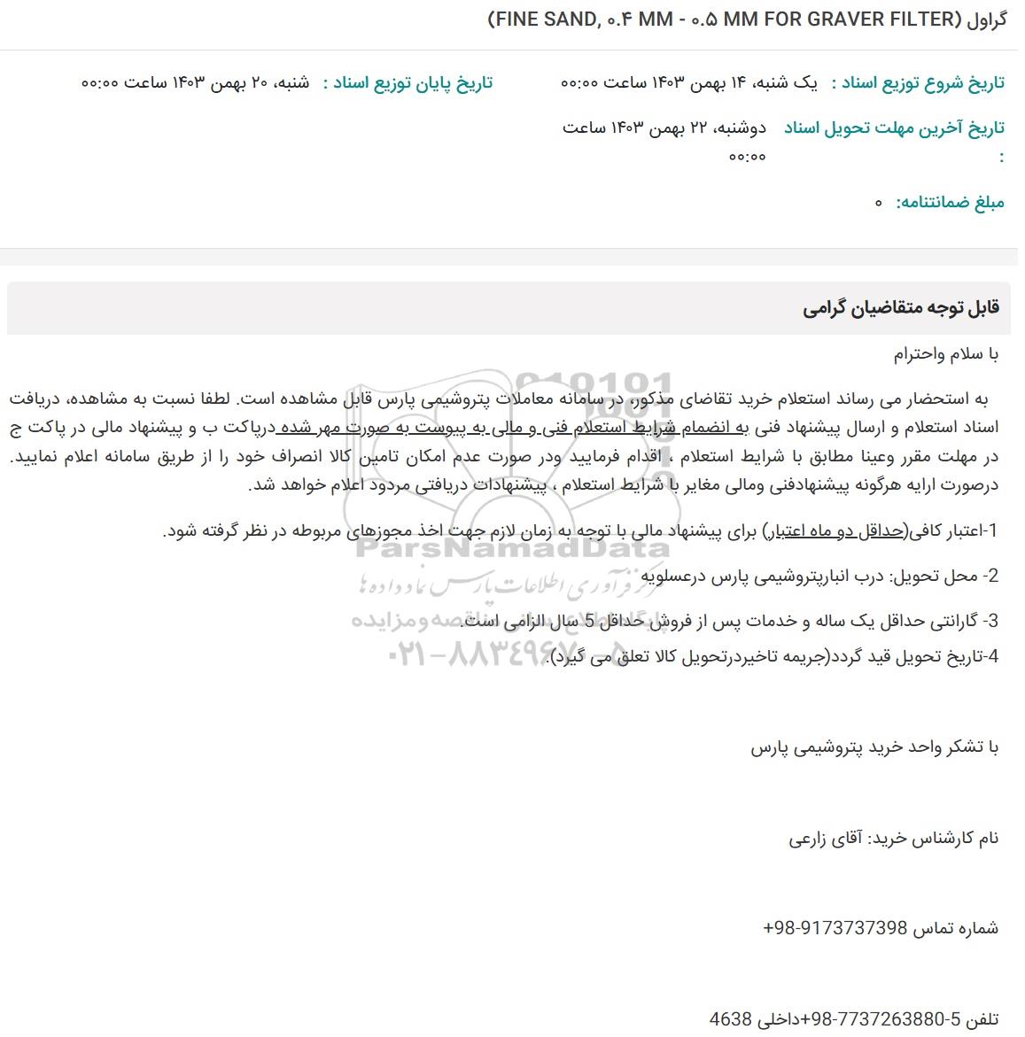 استعلام بها و موضوع استعلام استعلام گراول FINE SAND, 0.4 - 0.5MM FOR GRAVER FILTER به اطلاع کلیه شرکتها و افراد متخصص واجد شرایط میرساند، آگهی گذار در نظر دارد از طریق استعلام بها، نسبت به انتخاب و دریافت پیشنهادات اقدام نماید. این استعلام با کد آگهی ثبت شده در سامانه خبرگزاری پارس نماد : 8633096 منتشر شده است. مشخصات استعلام : تاریخ شروع استعلام: 1403/11/15 آخرین مهلت ارسال پیشنهاد قیمت : 1403/11/20 و محل اجرای پروژه : استان بوشهر میباشد. استعلام قیمت مورد درخواست : استعلام گراول FINE SAND, 0.4 - 0.5MM FOR GRAVER FILTER با دستهبندیهای تخصصی و گروه های مرتبط : انواع فیلتر های تصفیه, تجهیزات نفت و گاز, استعلام اطلاع رسانی میگردد.