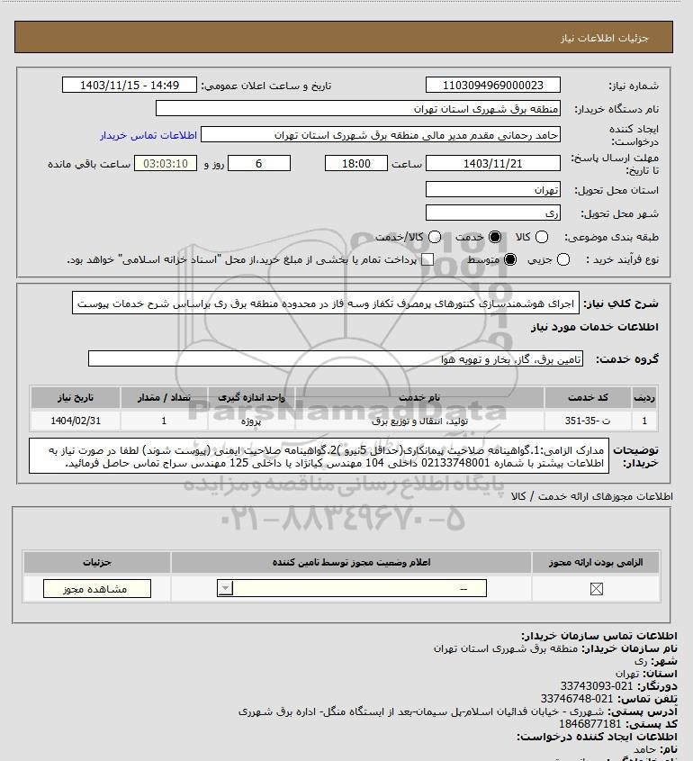 استعلام اجرای هوشمندسازی کنتورهای پرمصرف تکفاز وسه فاز در محدوده منطقه برق ری براساس شرح خدمات پیوست, استعلام اجرای هوشمندسازی کنتورهای پرمصرف تکفاز وسه فاز در محدوده منطقه برق ری براساس شرح خدمات پیوست