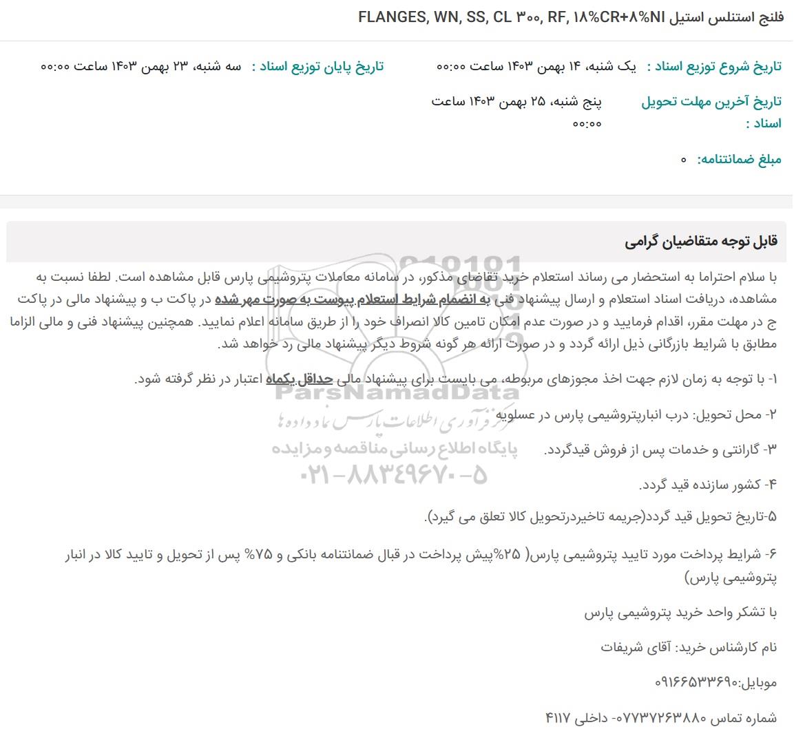 با سلام احتراما به استحضار میرساند استعلام خرید تقاضای مذکور در سامانه معاملات پتروشیمی پارس قابل مشاهده است. لطفا نسبت به مشاهده دریافت اسناد استعلام و ارسال پیشنهاد فنی به انضمام شرایط استعلام پیوست به صورت مهر شده در پاکت ب و پیشنهاد مالی در پاکت ج در مهلت مقرر اقدام فرمایید و در صورت عدم امکان تامین کالا انصراف خود را از طریق سامانه اعلام نمایید. همچنین پیشنهاد فنی و مالی الزاما مطابق با شرایط بازرگانی ذیل ارائه گردد و در صورت ارائه هر گونه شروط دیگر پیشنهاد مالی رد خواهد شد.